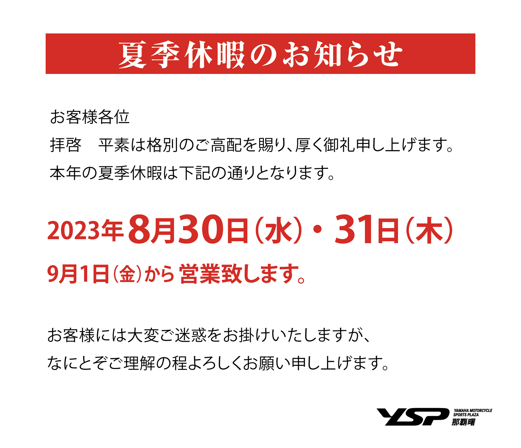お客様各位拝啓 平素は格別のご高配を賜り、厚く御礼申し上げます。本年の夏季休暇は下記の通りとなります。 2023年8月30日(水)・31日(木) 9月1日(金)から営業致します。 お客様には大変ご迷惑をお掛けいたしますが、なにとぞご理解の程よろしくお願い申し上げます。